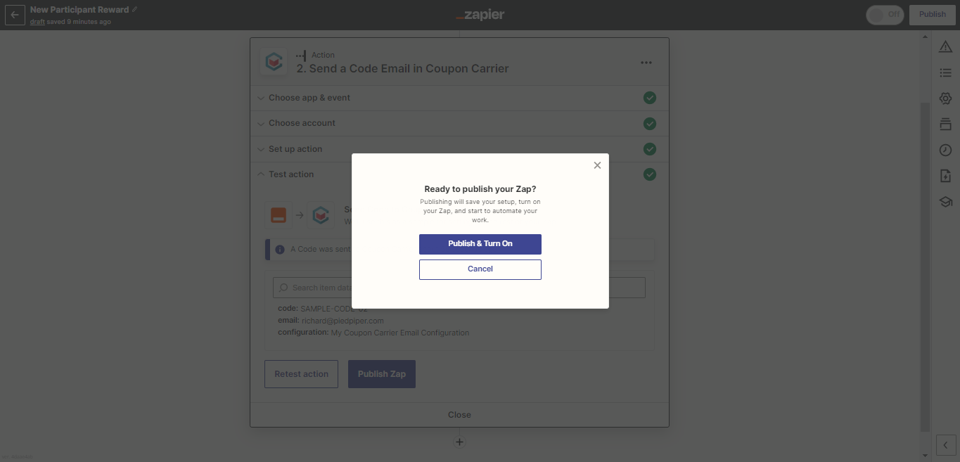 You've now successfully set up the Zap action. Click the **Publish Zap** bottom to finish, then click **Publish & Turn On**. Your Zap is now live and will send a coupon whenever a LoyaltySurf participant reaches a loyalty action goal and unlocks a reward.