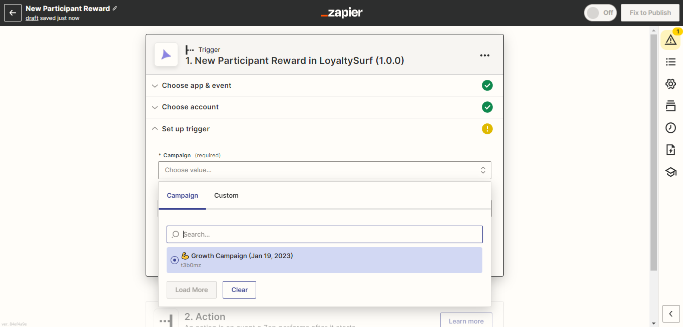 You've now successfully set up the Zap to trigger on a new LoyaltySurf participant. Now it's time to create the action of adding/updating the new LoyaltySurf participant.